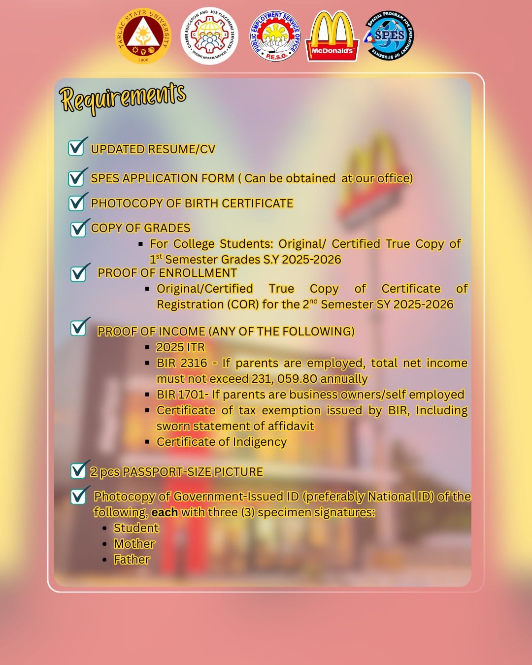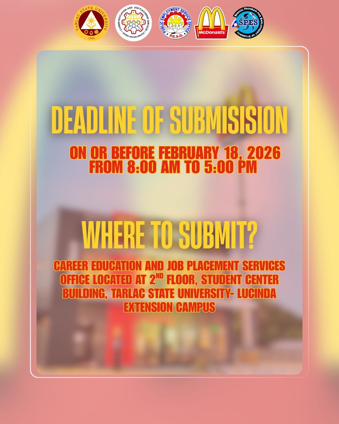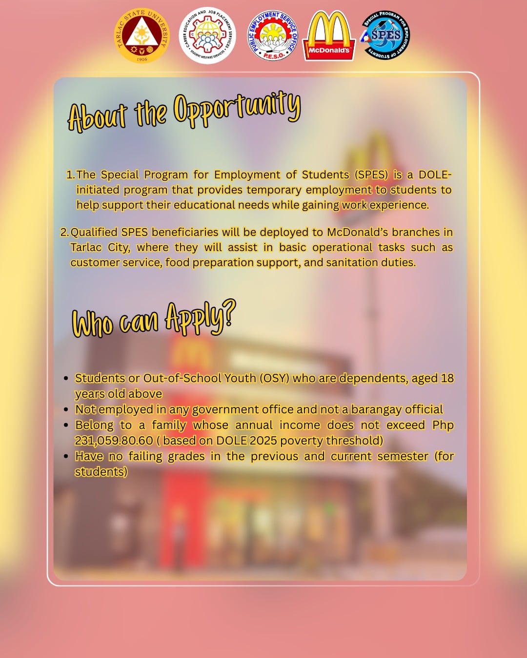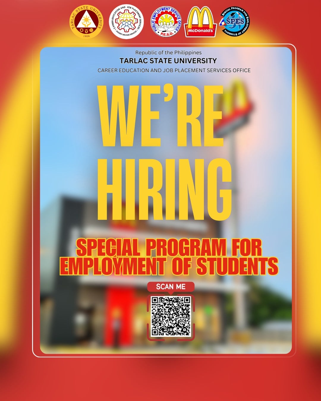 The Special Program for Employment of Students (SPES) is now open! This opportunity is made possible through the collective efforts of Tarlac State University – Career Education and Job Placement Services Unit (CEJPS), the Department of Labor and Employment (DOLE), PESO Tarlac City, in partnership with McDonald’s Tarlac City.
