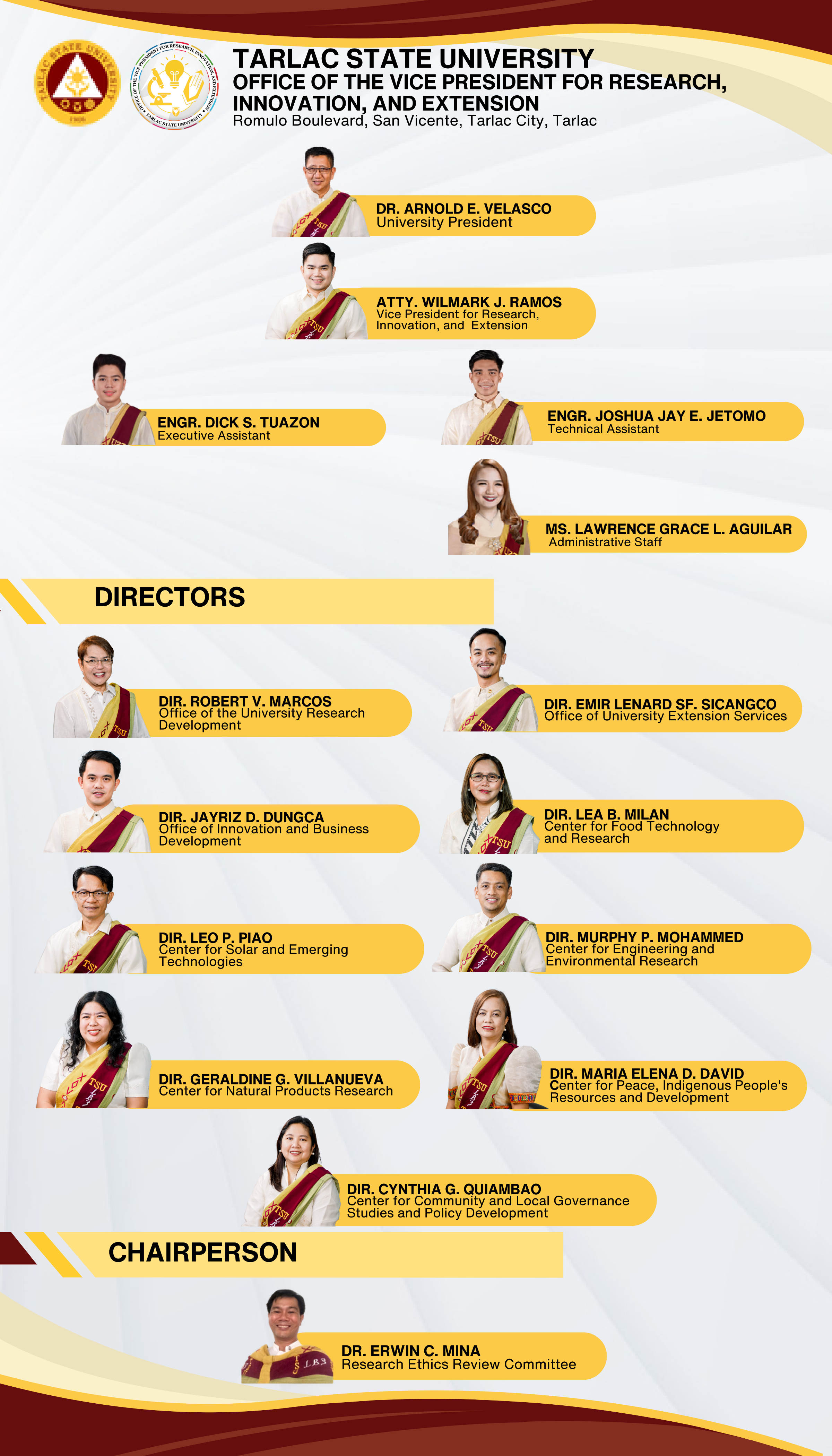 Office of the Vice President for Research and Extension Services Office of University Research Development Office of the University Extension Services Gender and Development Technology Development Transfer and Commercialization Office Research Ethics Review Committee Food Technology and Research Center Center for Community and Local Governance Studies and Policy Dev...